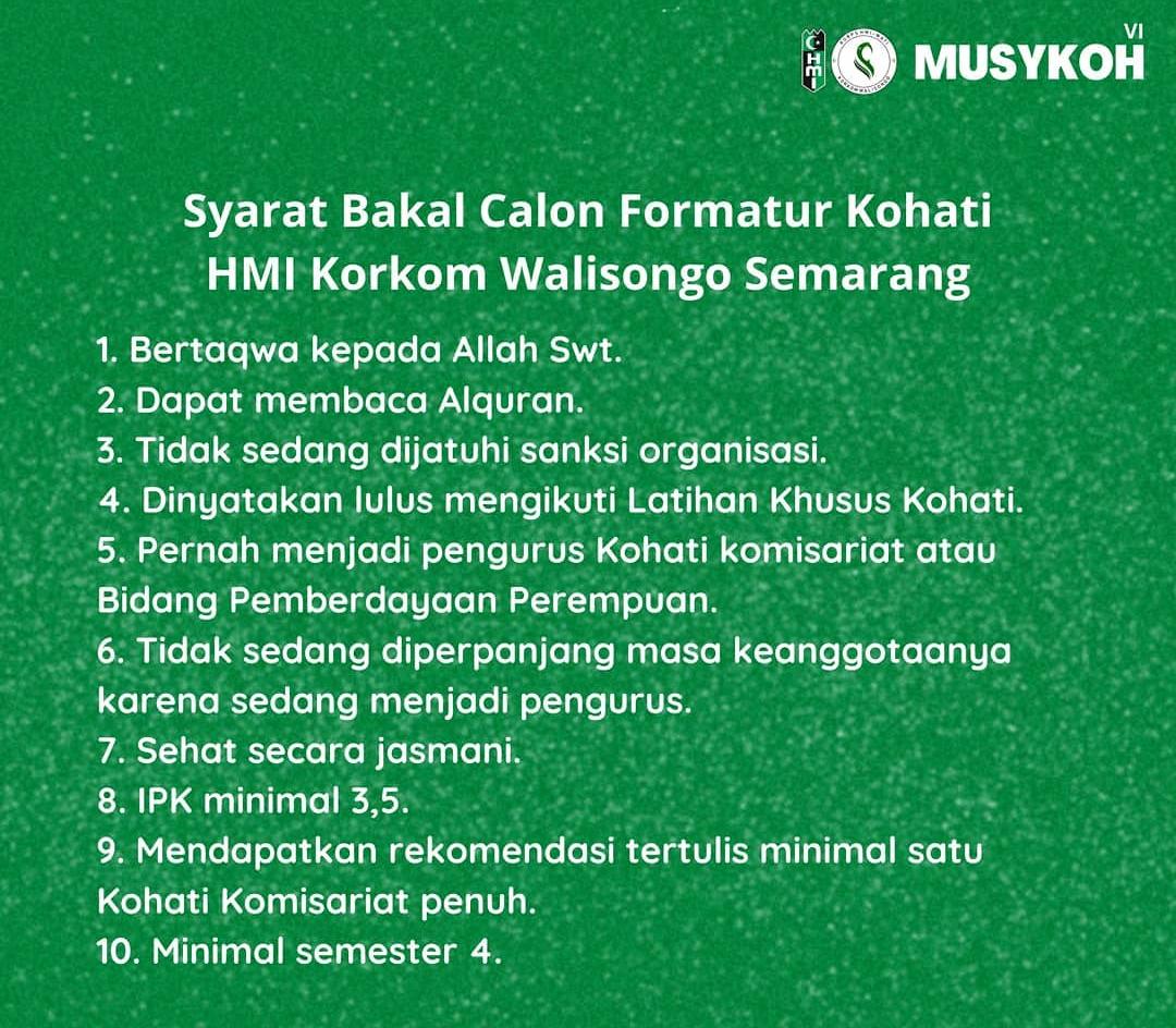 Sebelumnya, sudah diumumkan melalui instagram dan Whatsapp Group tentang persyaratan bakal calon formatur Kohati-HMI Korkom Walisongo Semarang, di antaranya adalah: